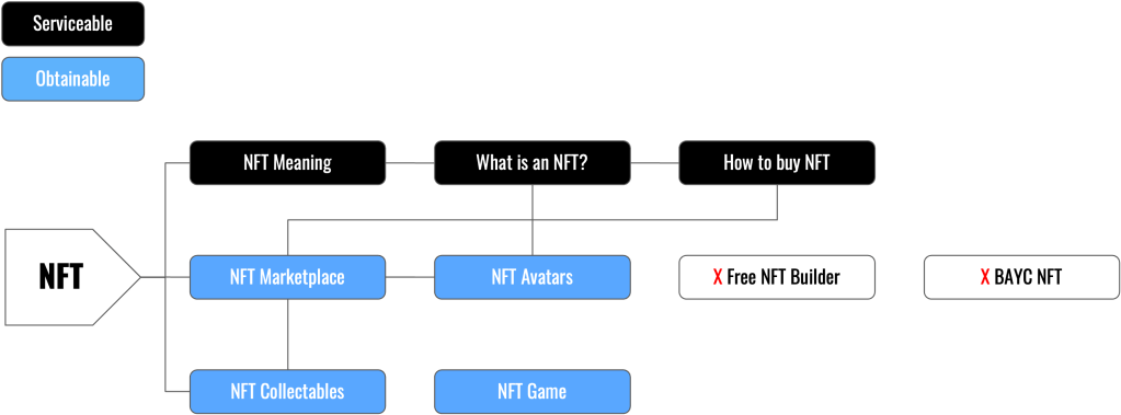 Serviceable keywords, i.e. keywords we can utilise to enter a user into a funnel. Whether that be TOTF, MOTF or BOTF, this is content we can produce that is inherently aligned to a core product or solution your project provides. In this case, we can utilise educational content to capture users in the information gathering and educational stages to have your project top of mind when they want to fully enter the NFT project and create or connect their wallet.